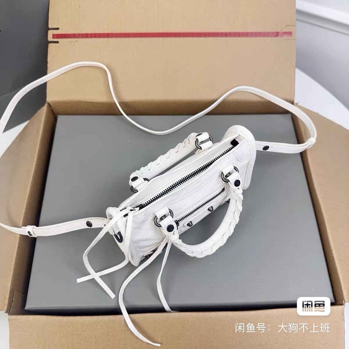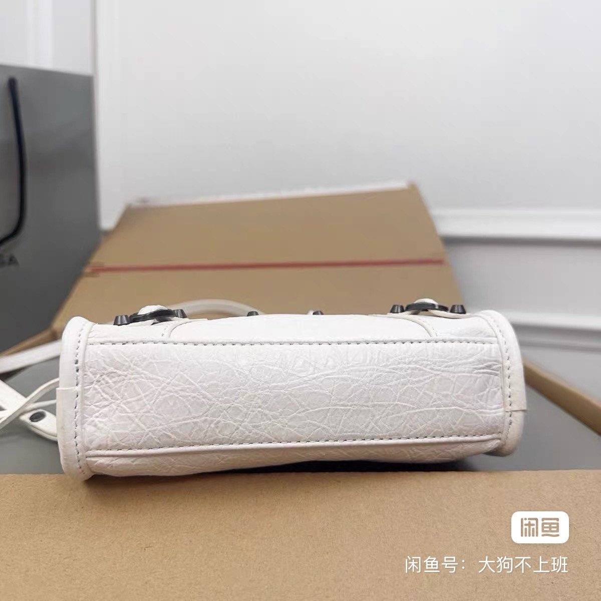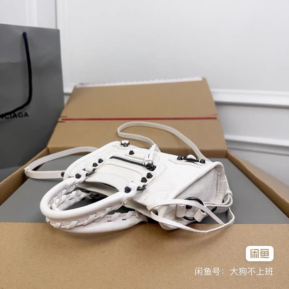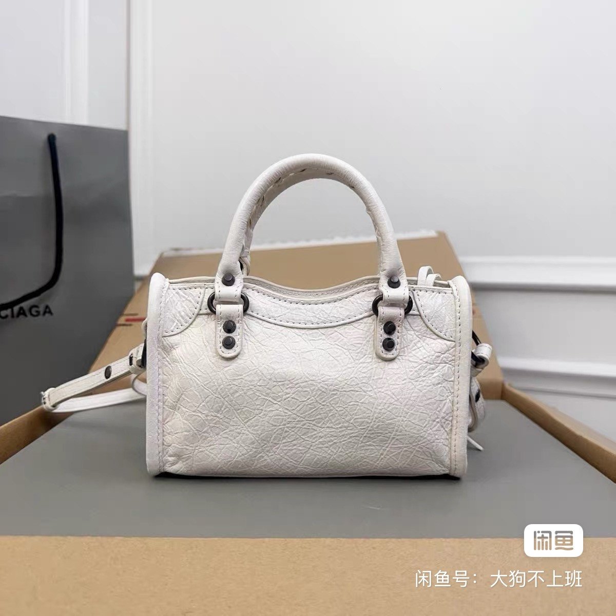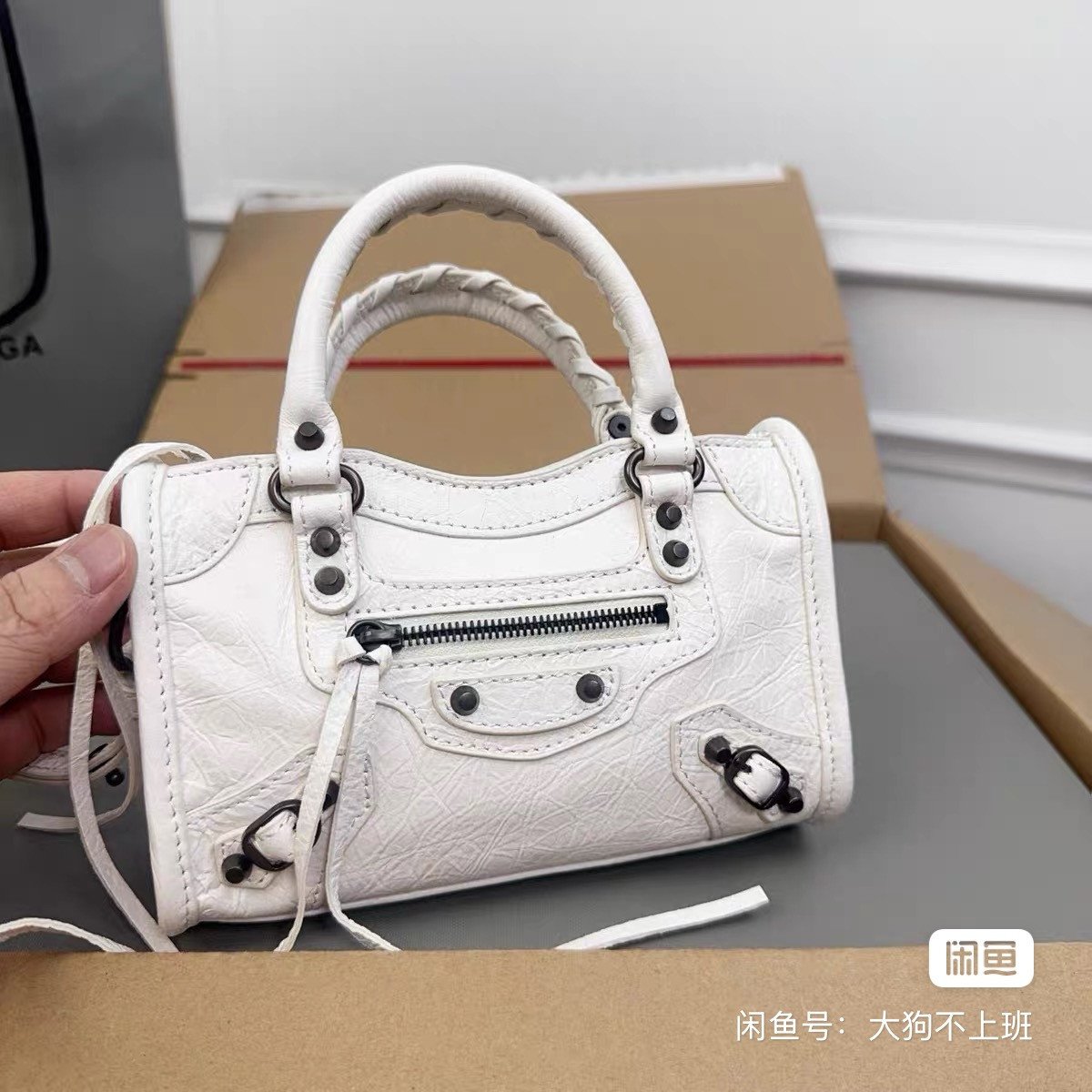 Balenciaga Parisian nano locomotive bag, white cracked sheepskin, size 18*12*6cm, brand-new authentic box, classic rivet design with braided belt, super versatile small bag, can put mobile phone passport, if you like it, hurry up, the price is negotable~