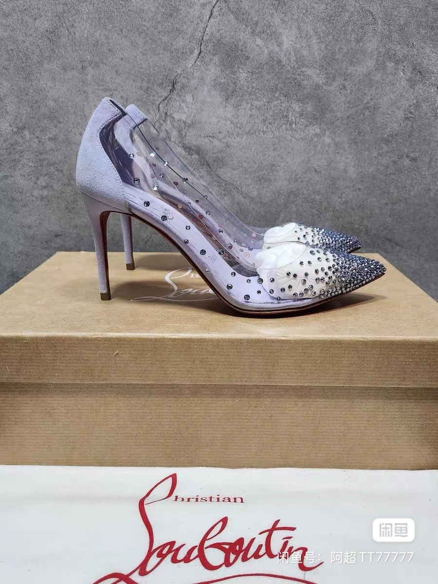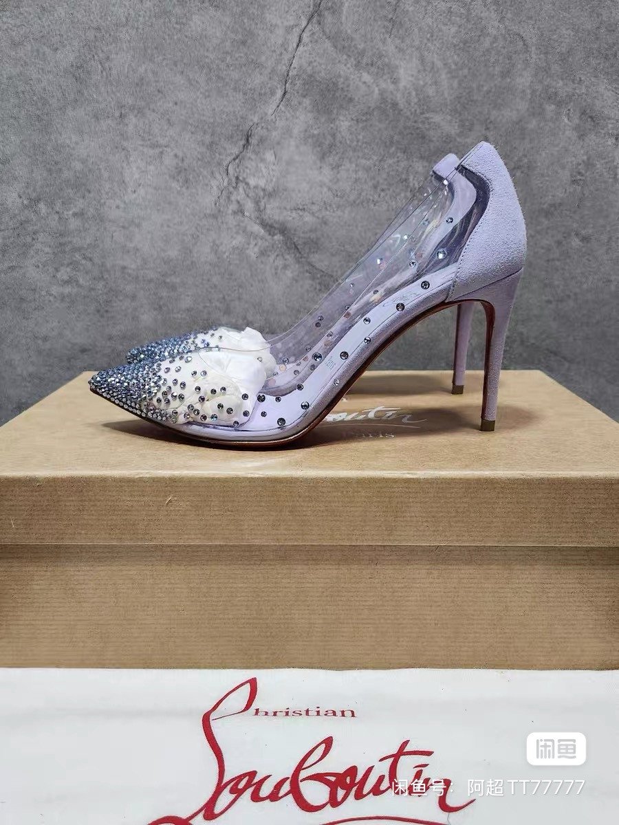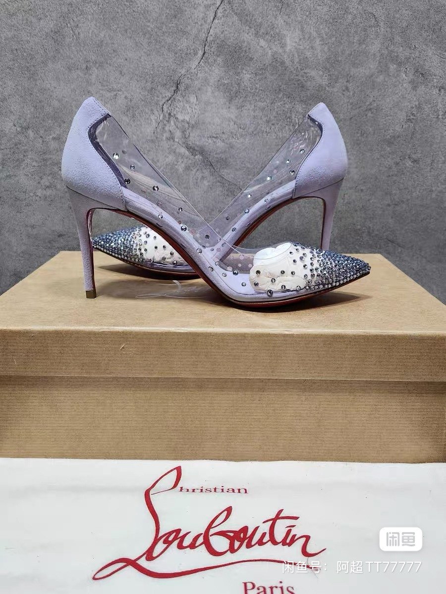 Christian louboutin CL lilac purple suede pointed toe PVC crystal full diamond thin heel high heels wedding shoes red sole shoes. Women's shoes size 34.5, with a heel height of 85mm. Brand new and unworn, a full set can be given away.