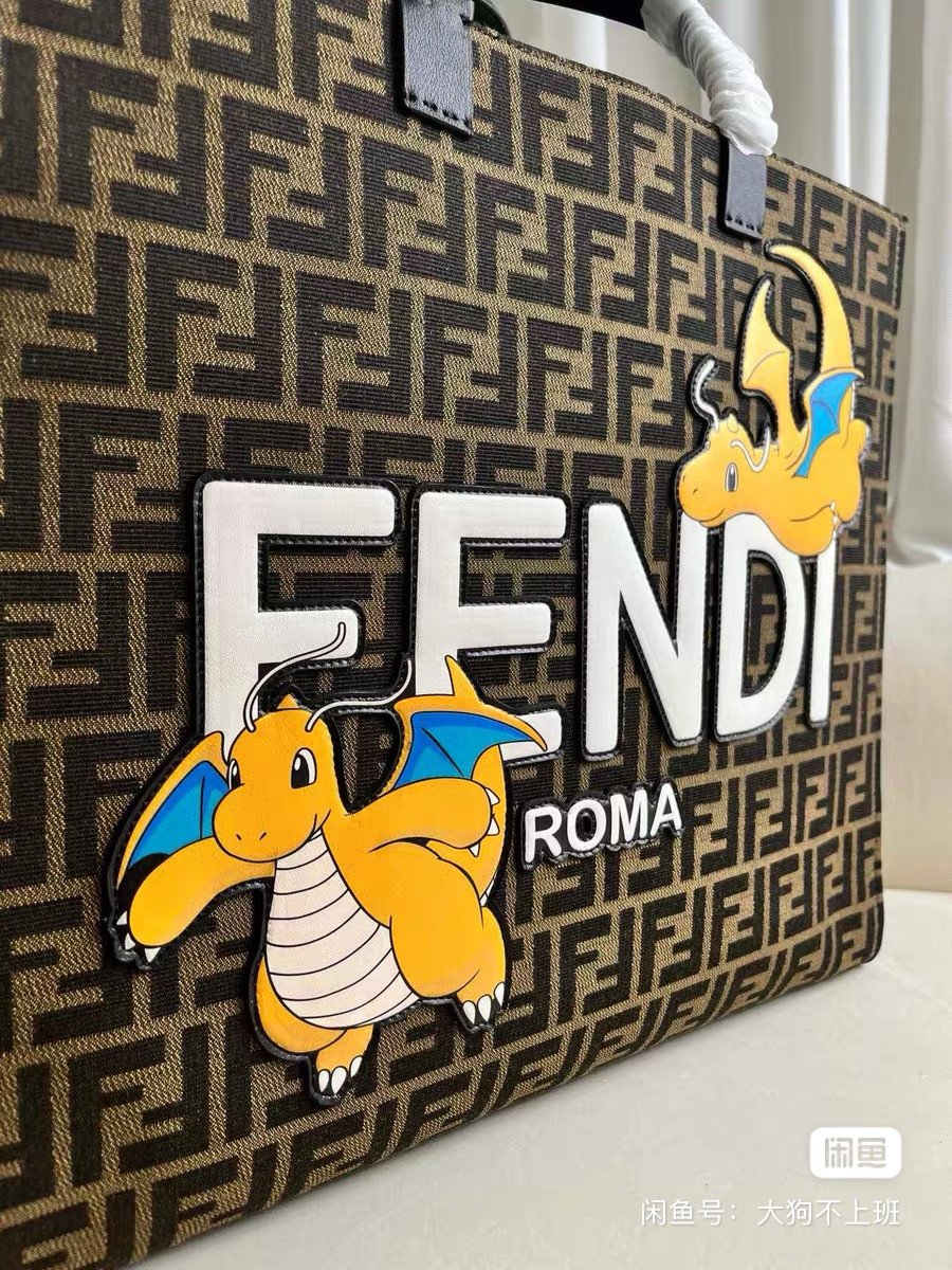 FENDI Pokemon co-branded tote bag, classic old flower color matching, Kuailong big logo is super cute! The size is 41x35x19cm, the full leather hand strap design does not squee the hand, and the wide shoulder strap can be carried or cross-body.
