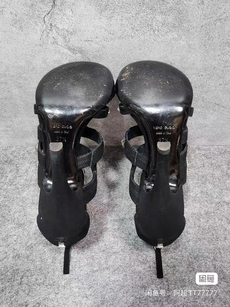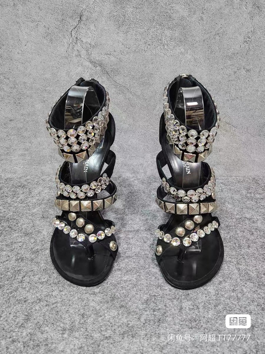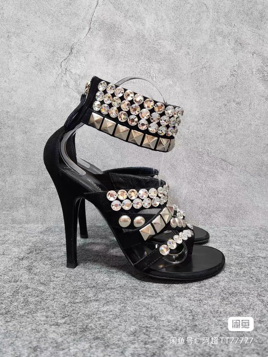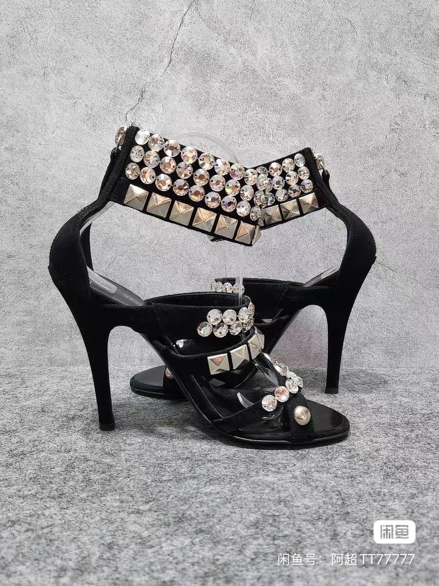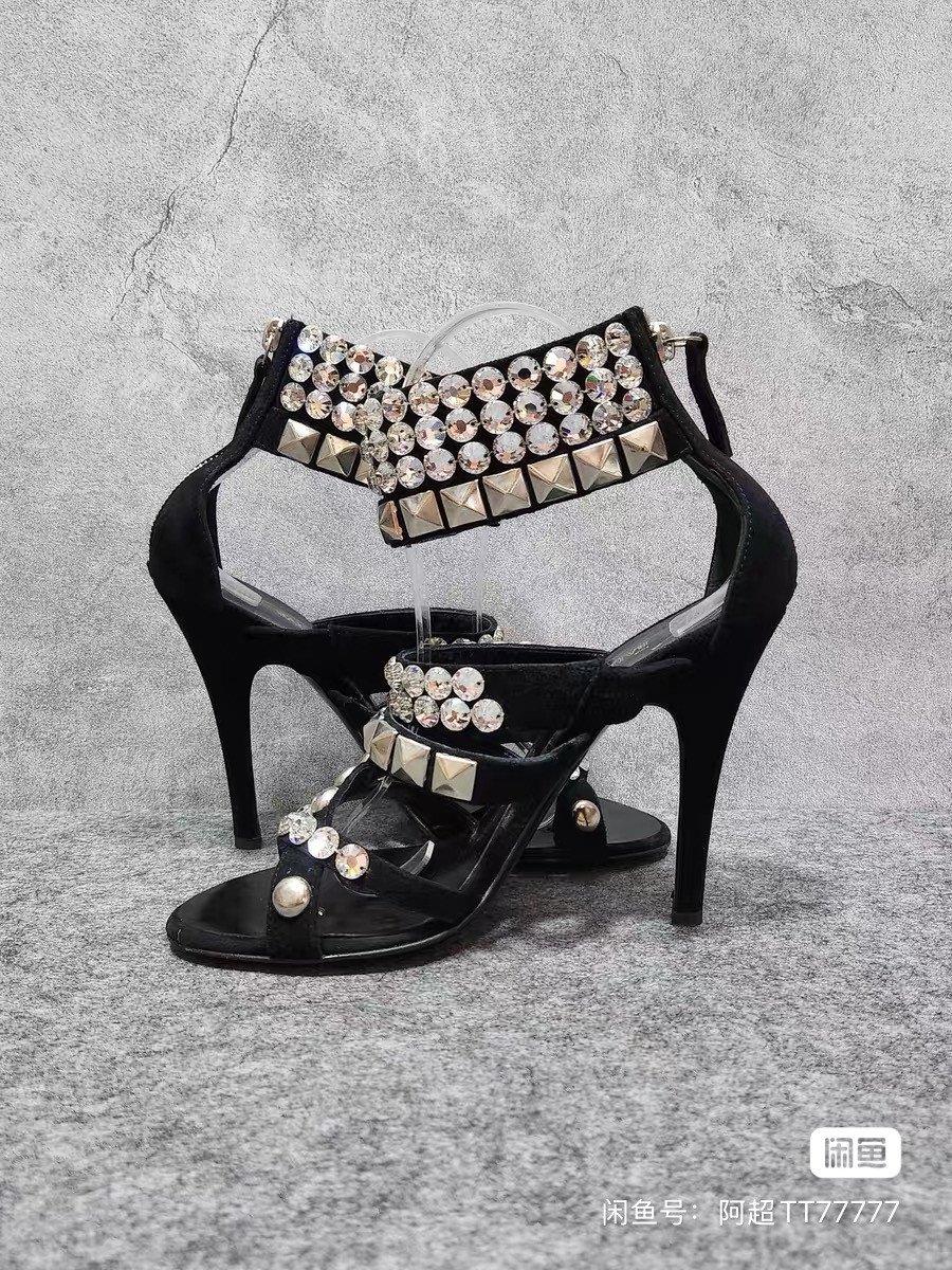 Giuseppe Zanotti x BALMAIN GZ and Balmain co-branded black suede open toe rivet crystal decoration back zipper thin heel sandals. Women's shoes size 37.5, with a heel height of 11cm. The overall color is very good. I have worn it once or twice, and it is customized 98 new. There are no obvious defects, no damage, and no rivet crystals on the upper. The sole is very slightly worn, and the bottom is not attached, so the traces of use are obvious.