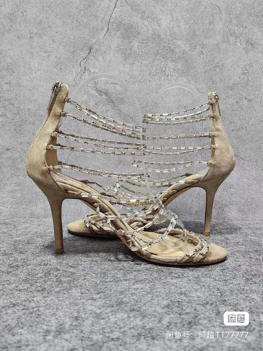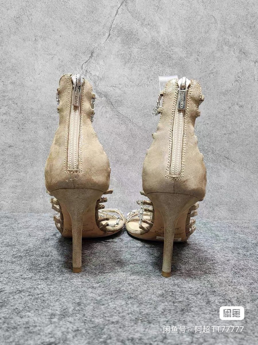 JIMMY CHOO Zhou Yangjie beige open toe crystal decoration back zipper thin heel high heels. Women's shoes size 37.5, heel height 8.5cm. The overall color is good, and I haven't worn it many times. It's customized 95 new.