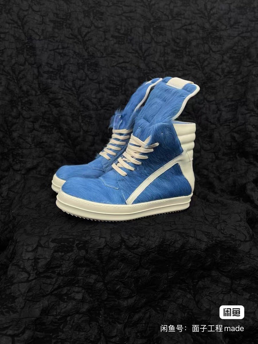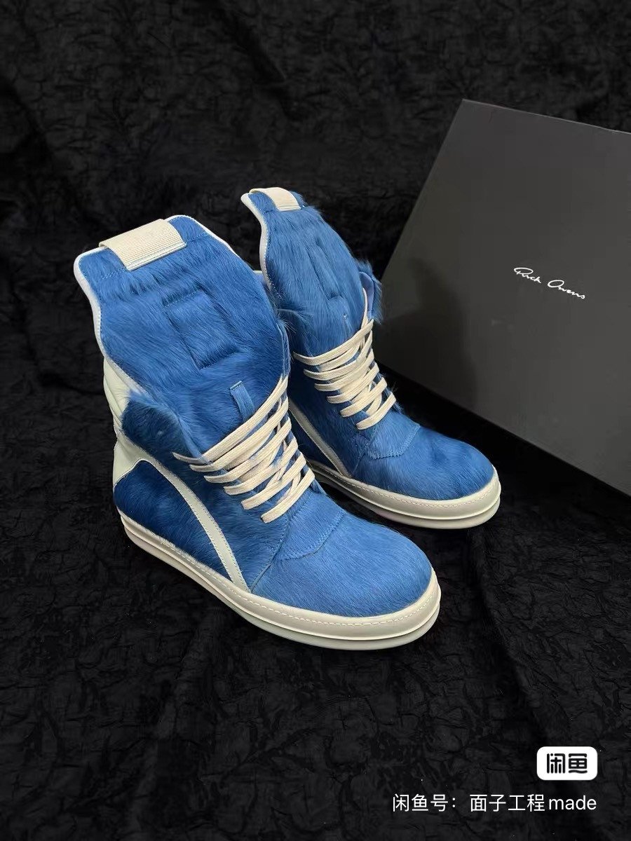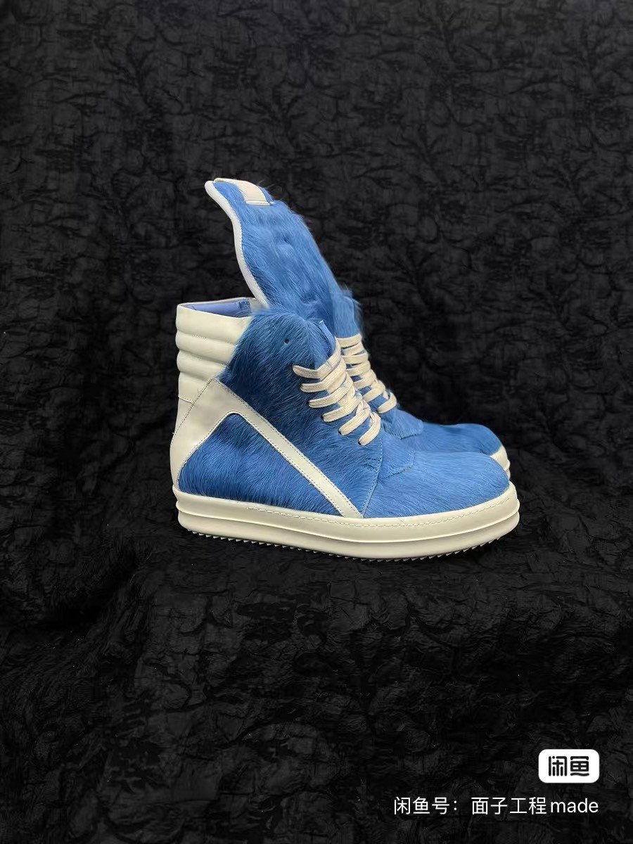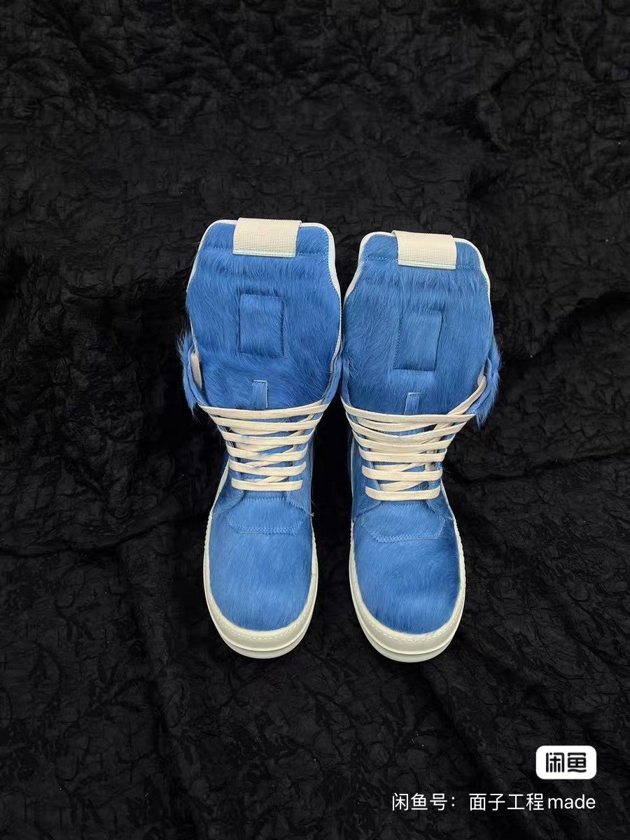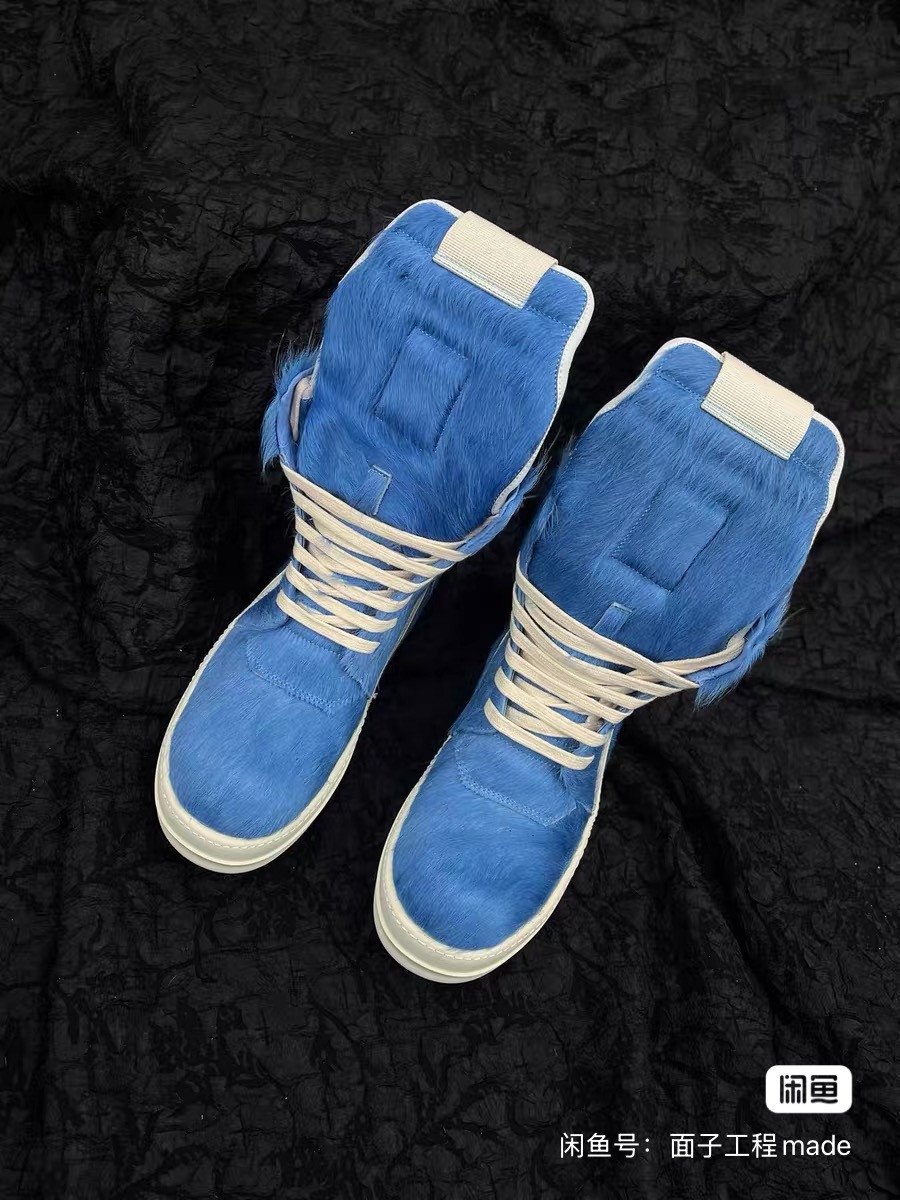 Rick Owens blue horsehair high-top shoes, new classic inverted triangle design, unique horsehair material, same style for men and women. It is suitable for wearing in all seasons.