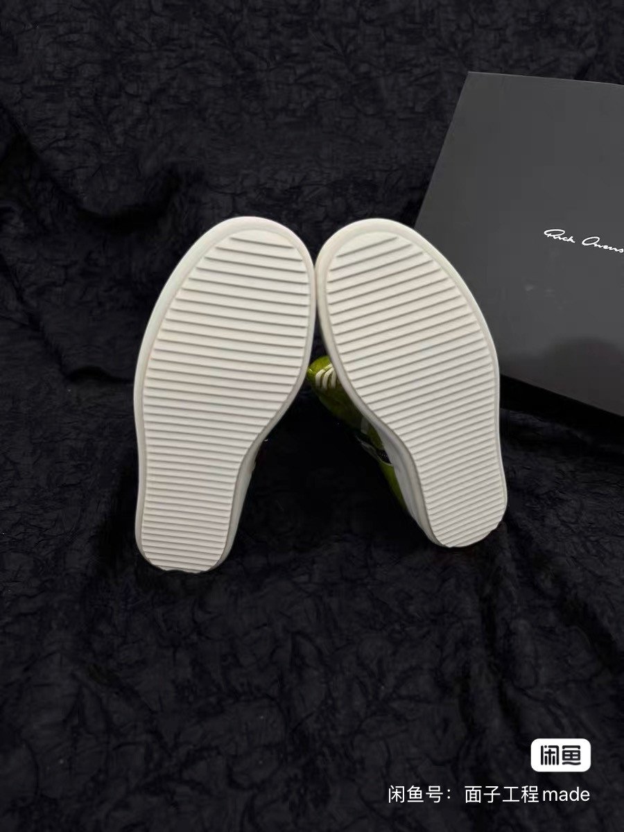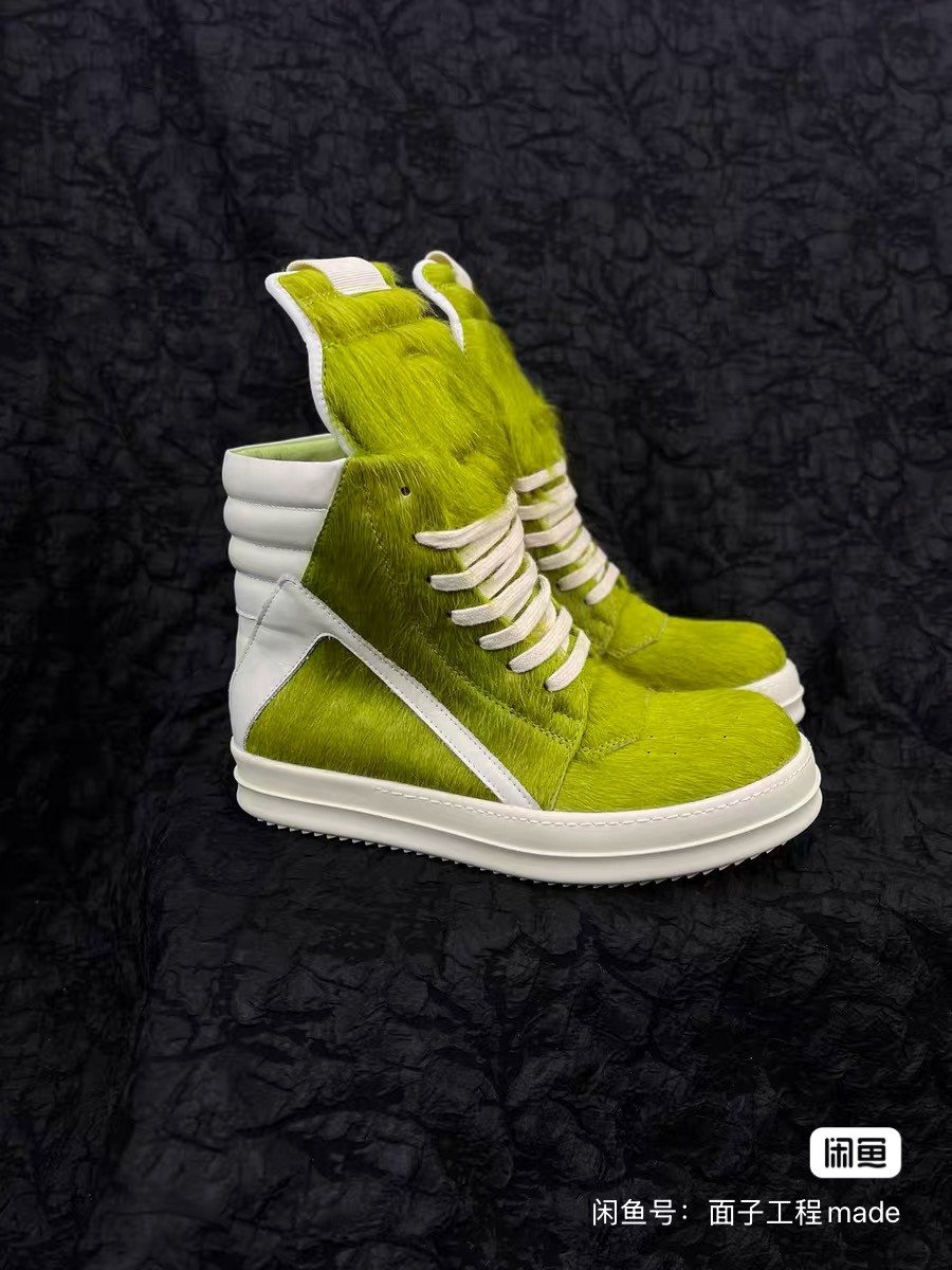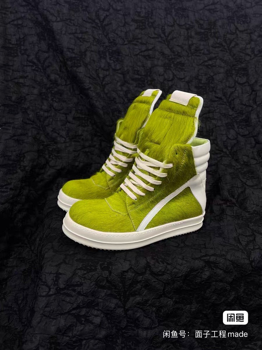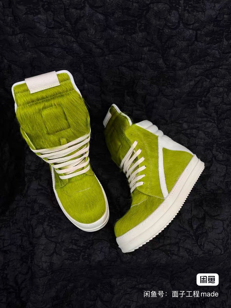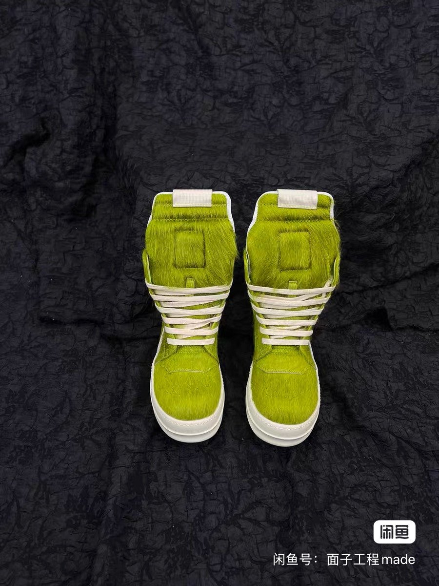 Rick Owens grass green horsehair high-top shoes, new classic inverted triangle design, unique horsehair material, same style for men and women. It is suitable for wearing in all seasons.