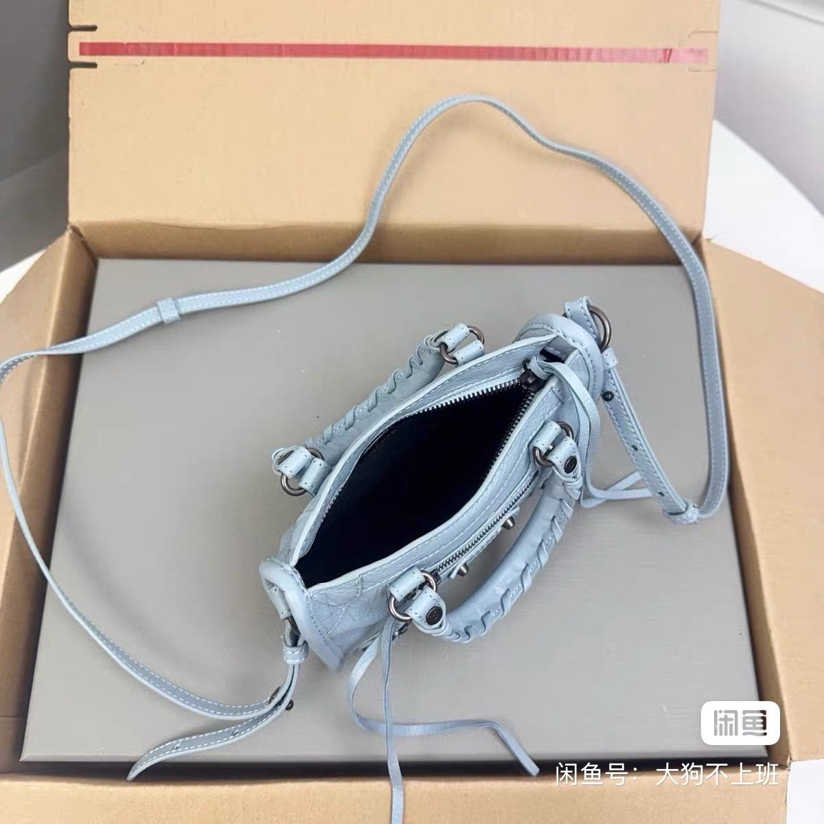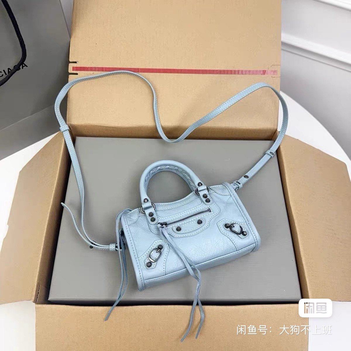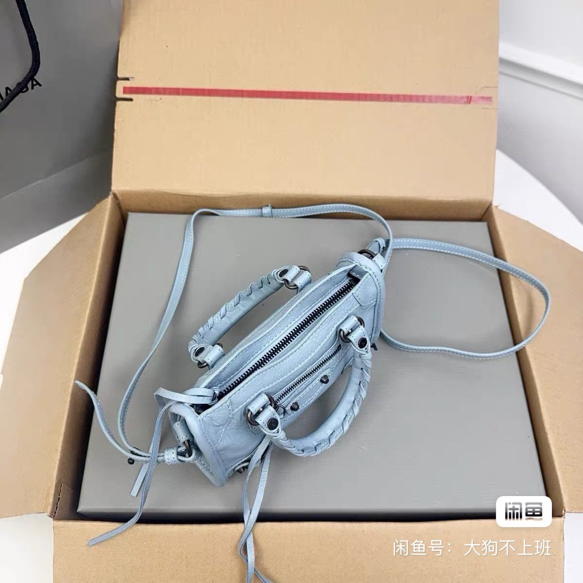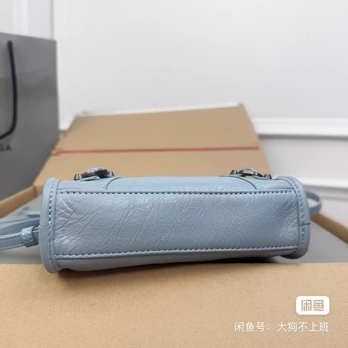 Balenciaga Parisian nano locomotive bag, light blue cracked sheepskin, size 18*12*6cm, brand new and unused. Classic rivet design, with a long strap that can be worn on one shoulder, black lining inside, exquisite workmanship.