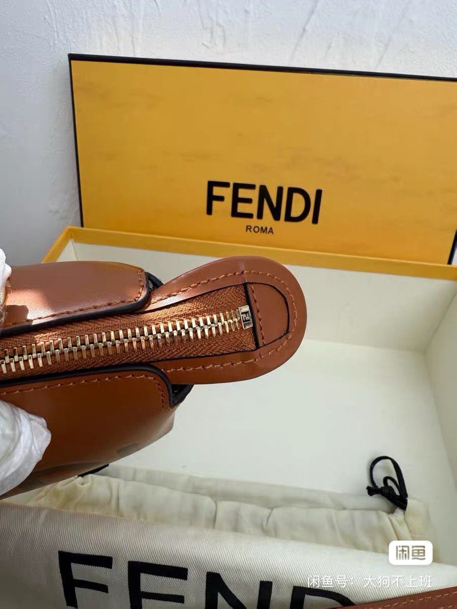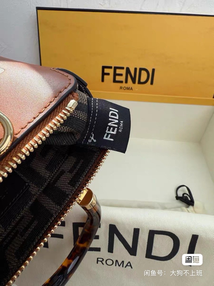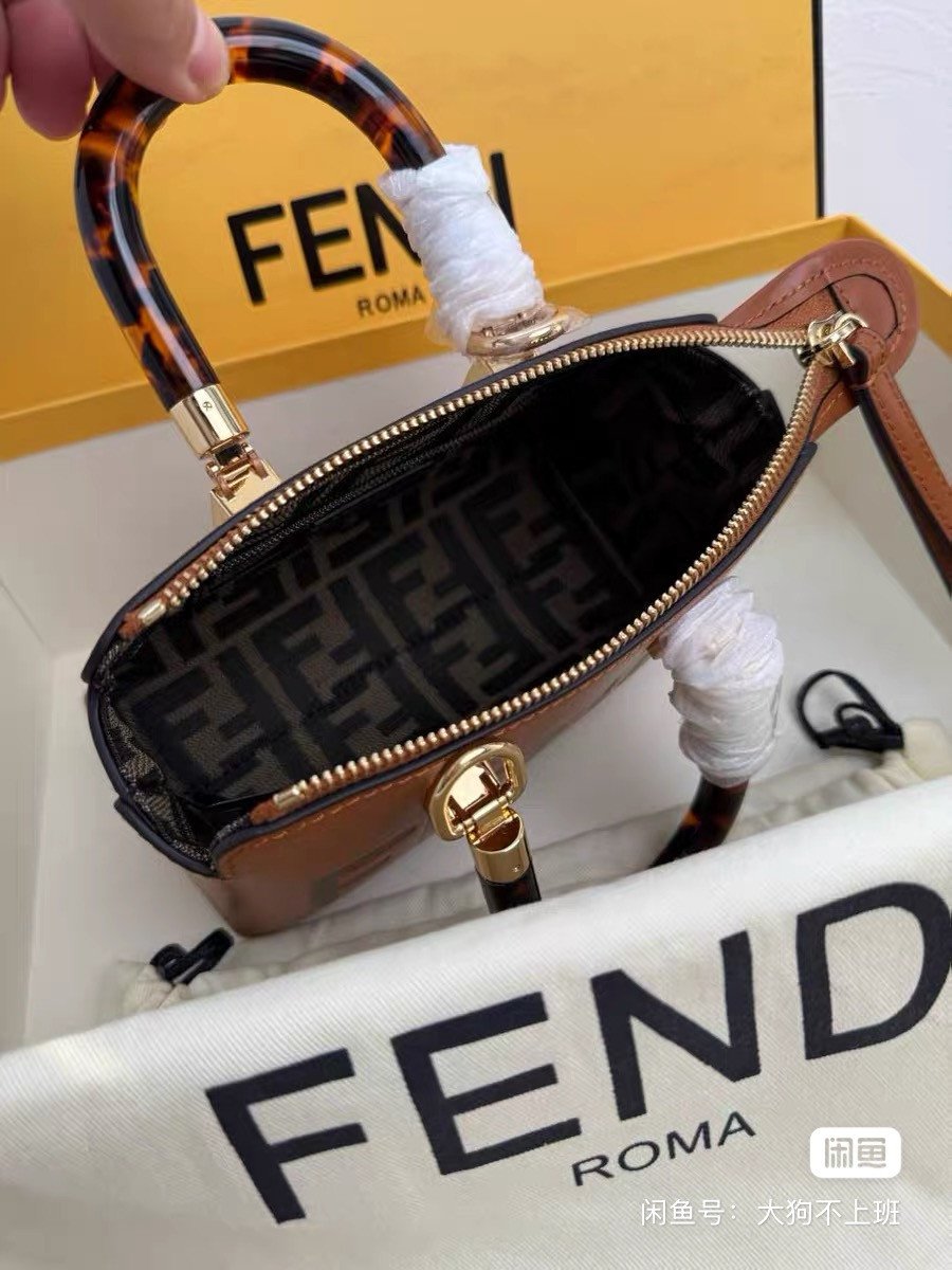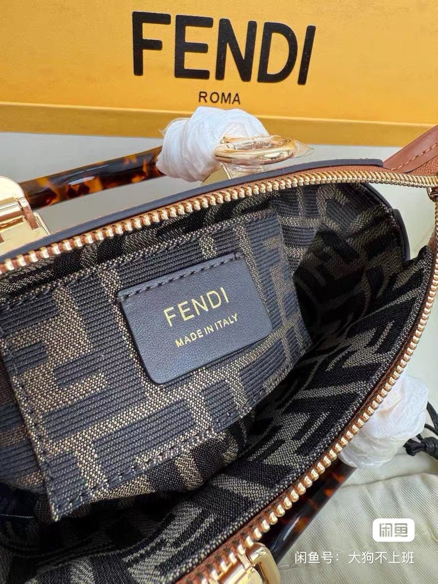 Fendi ByTheWay mini bag, caramel-colored calfskin, tortoise handle with gold hardware. The inside is printed with the FENDI logo and the zipper compartment design.