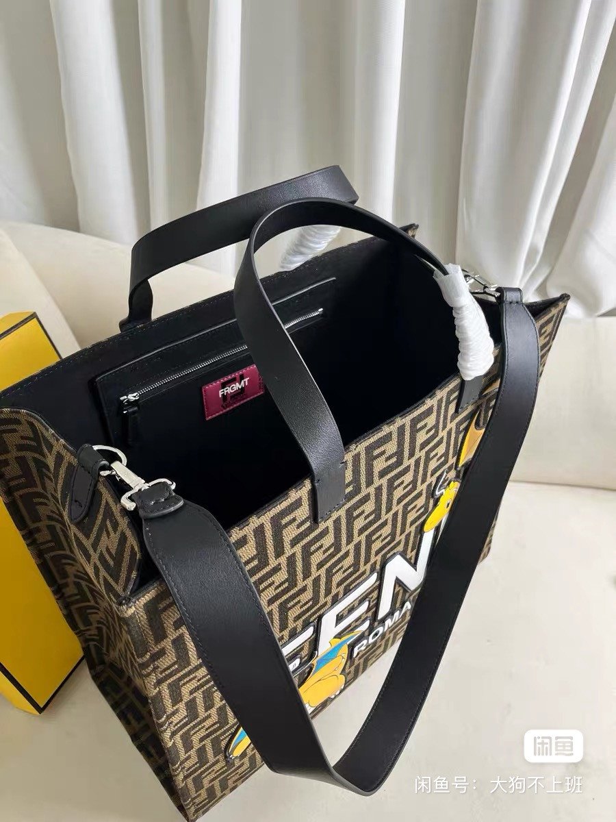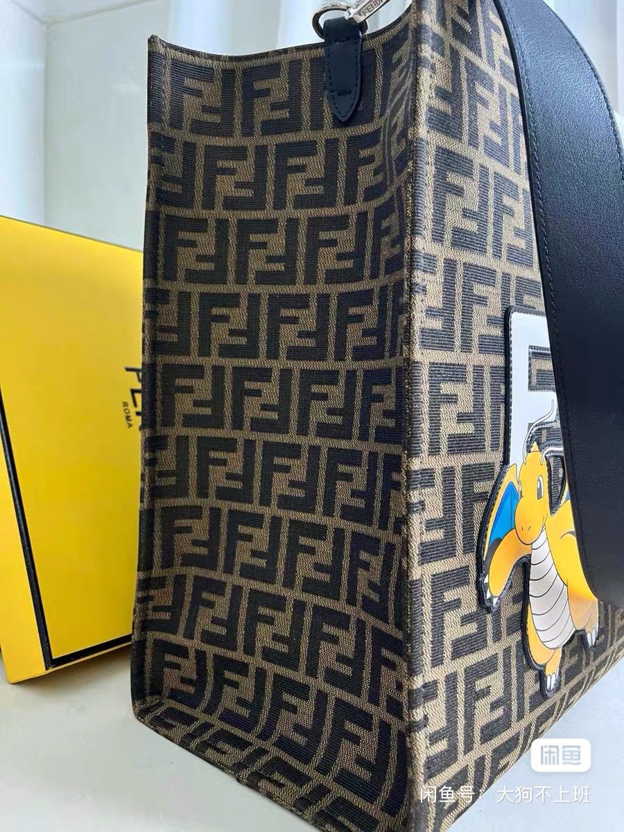 FENDI Pokemon co-branded tote bag, classic old flower color matching, Kuailong big logo is super cute! The size is 41x35x19cm, the full leather hand strap design does not squee the hand, and the wide shoulder strap can be carried or cross-body.