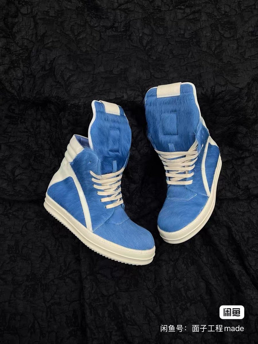 Rick Owens blue horsehair high-top shoes, new classic inverted triangle design, unique horsehair material, same style for men and women. It is suitable for wearing in all seasons.