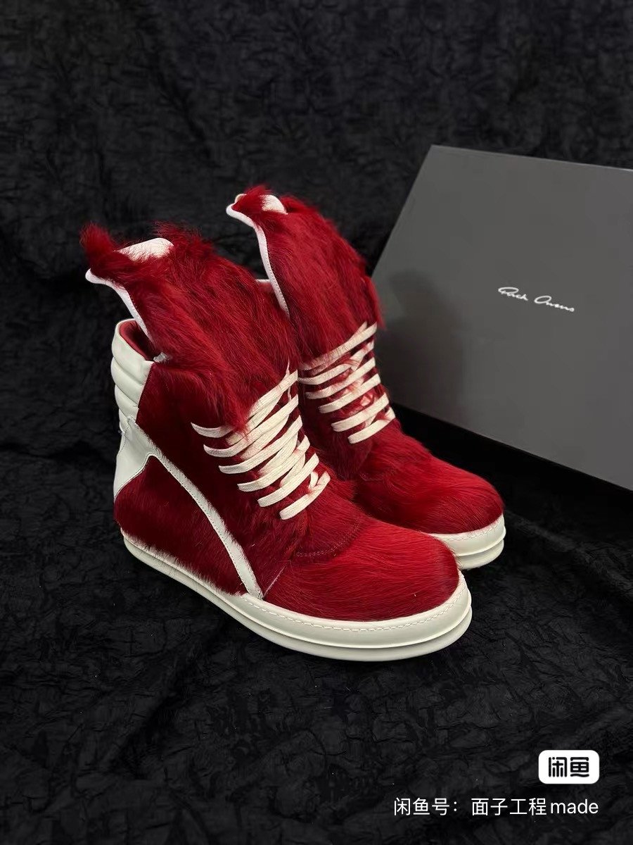 Rick Owens red horsehair high-top shoes, new classic inverted triangle design, unique horsehair material, same style for men and women.